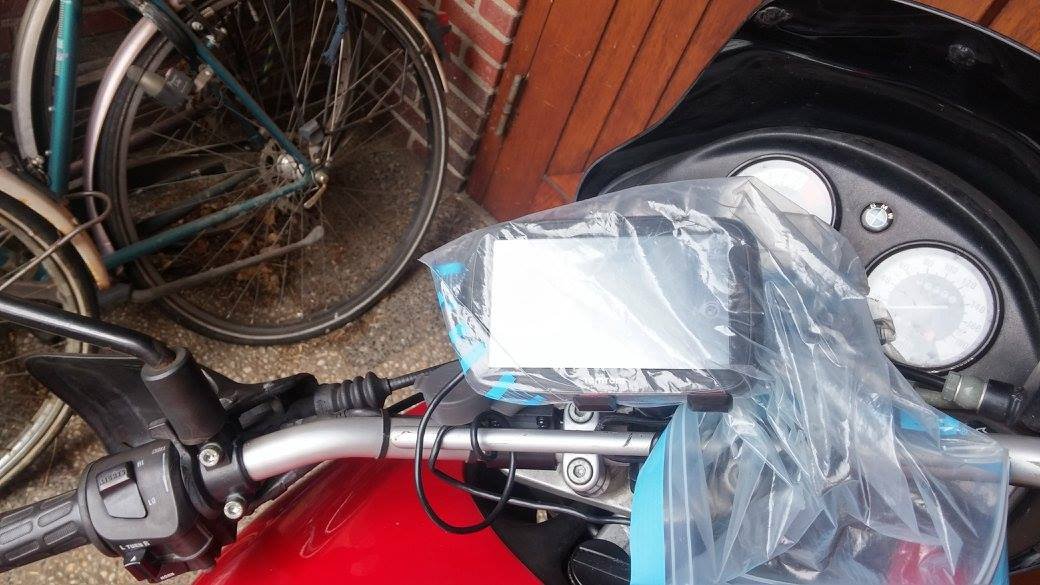 Ik had nog geen smartphone met internet, dus mijn navigatie was een auto-tomtom met een ziplock zakje er omheen, bevestigd in een telefoonhouder bedoeld voor een fiets.